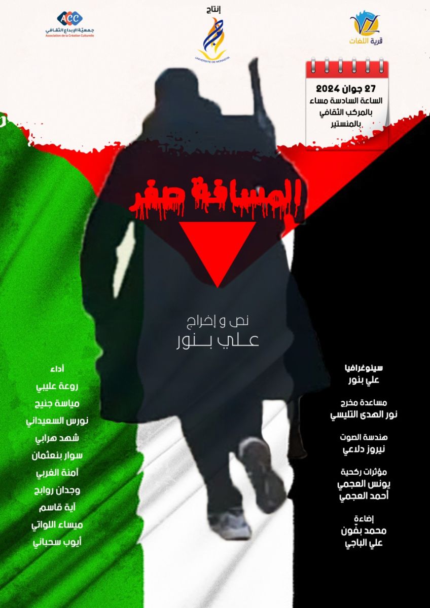 دعوة تضَامنًا مع أهلنا في قطاع غزّة الصامد... تدعُو جامعةُ المنستير كافةَ منظوريها من أساتذة وأعوان إدارة وطلبة لمواكبة مسرحية "المسافة صفر" بالمركب الثقافي بالمنستير وذلك يوم الخميس 27 جوان انطلاقا من الساعة السادسة مساءً. في حضوركم دعمٌ للقضية الفلسطينية العادلة وتشجيعٌ للإبداعات الطلابية بجامعة المنستير.