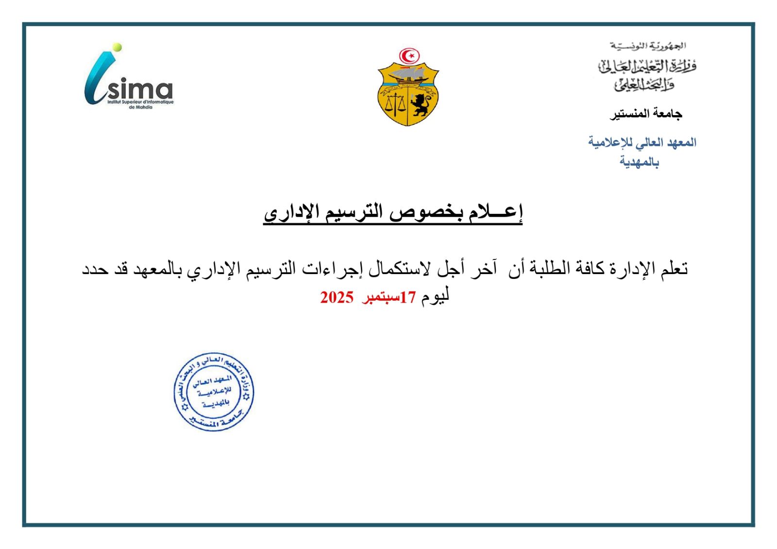 إعـــلام بخصوص الترسيم الإداري