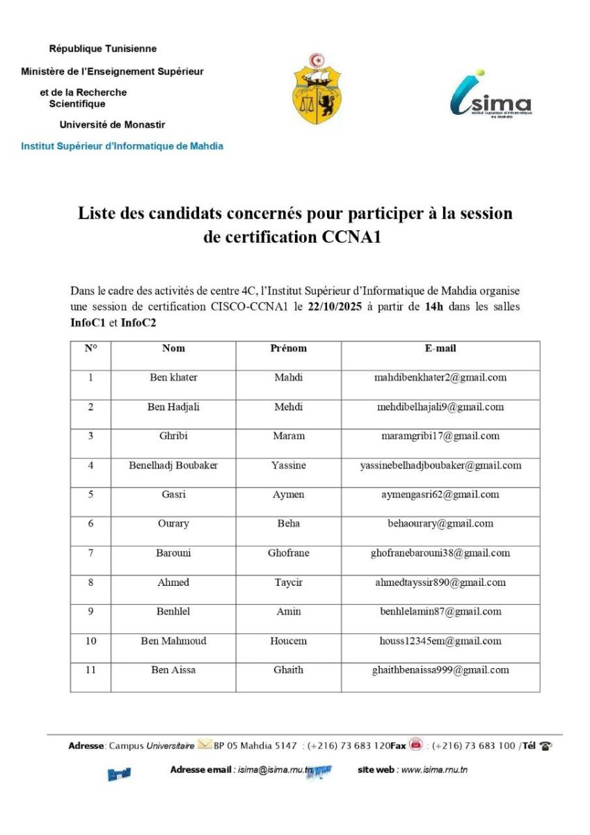 Dans le cadre des activités du centre 4C, l’Institut Supérieur d’Informatique de Mahdia organise une session de certification CISCO-CCNA1. La passation de l’examen final se déroulera le 22/10/2025 à partir de 14h dans les salles InfoC1 et Info C2.