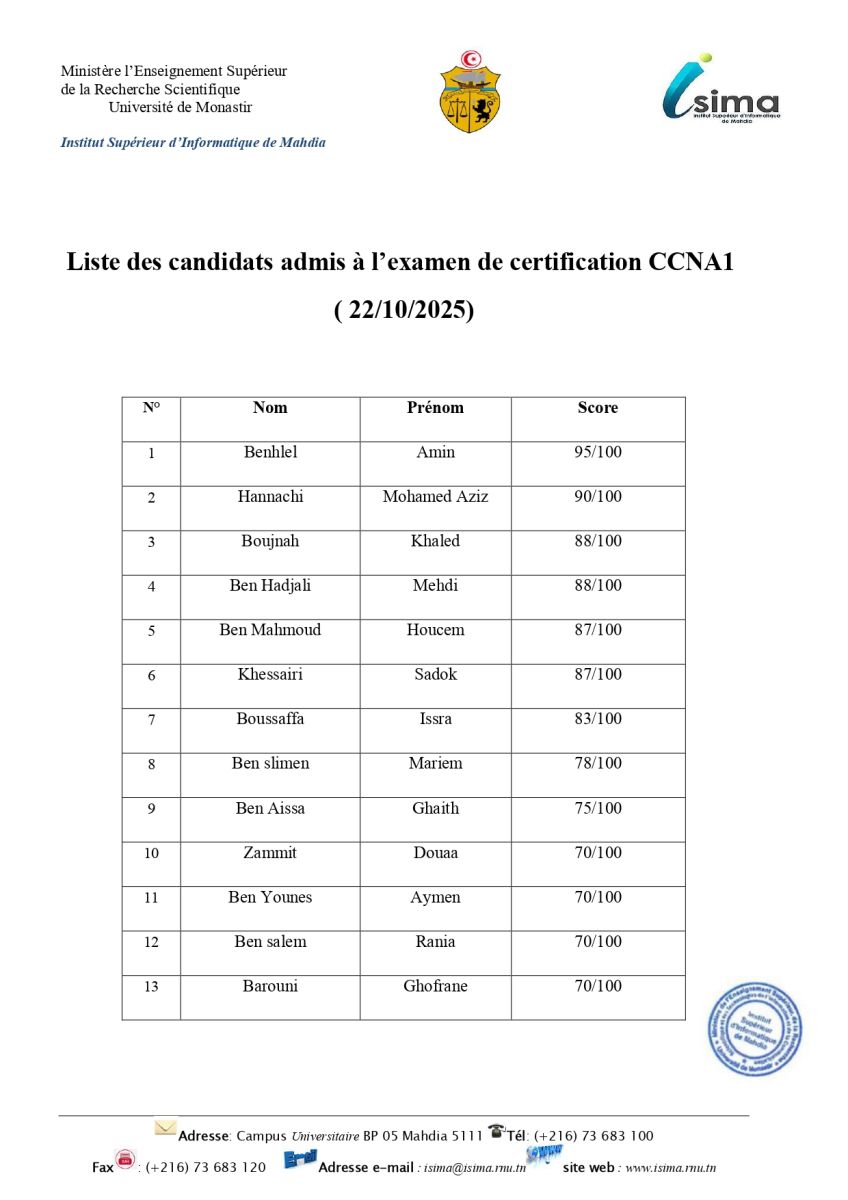 Liste des candidats admis à l’examen de certification CCNA1 ( 22/10/2025)