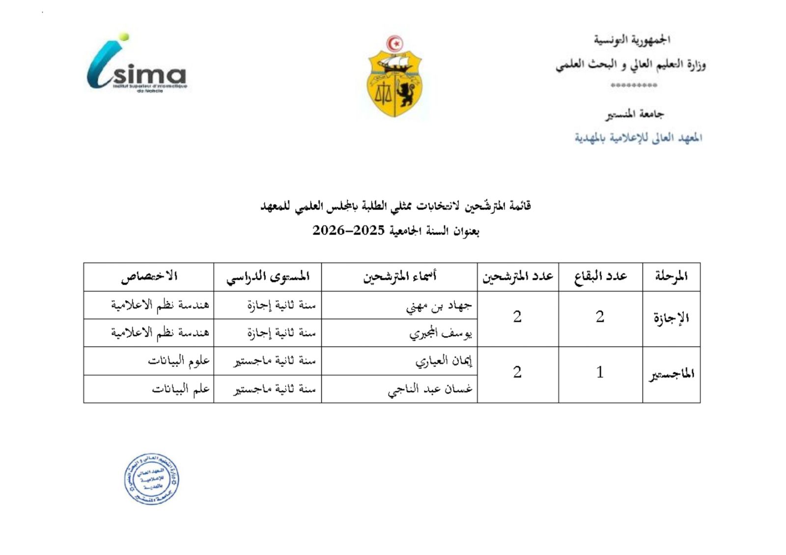 قائمة المترشّحين لانتخابات ممثلي الطلبة بالمجلس العلمي للمعهد بعنوان السنة الجامعية 2025-2026