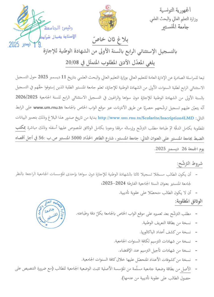 بالتسجيل الإستثنائي الرابع بالسنة الأولى من الشهادة الوطنية للإجازة