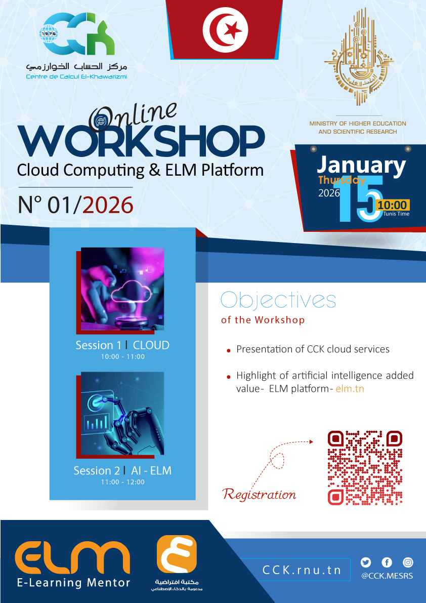 Le Centre de Calcul El-Khawarizmi (CCK) organise un workshop en ligne, le jeudi 15 janvier 2026 à 10h00 afin de présenter les services cloud offerts par le CCK ainsi les apports de l’intelligence artificielle, à travers le cas de la plateforme ELM - elm.tn.