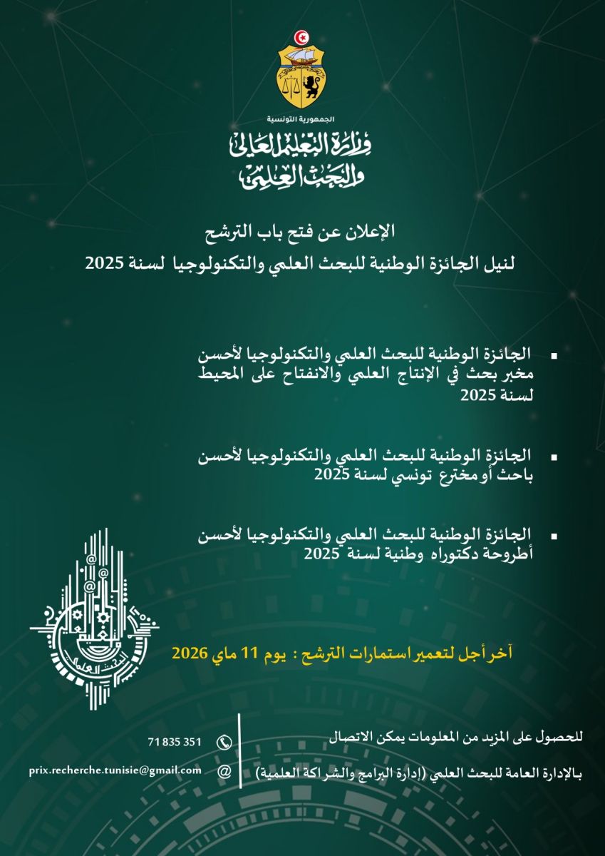 الجائزة الوطنية للبحث العلمي والتكنولوجيا لأحسن باحث أو مخترع تونسي لسنة 2025