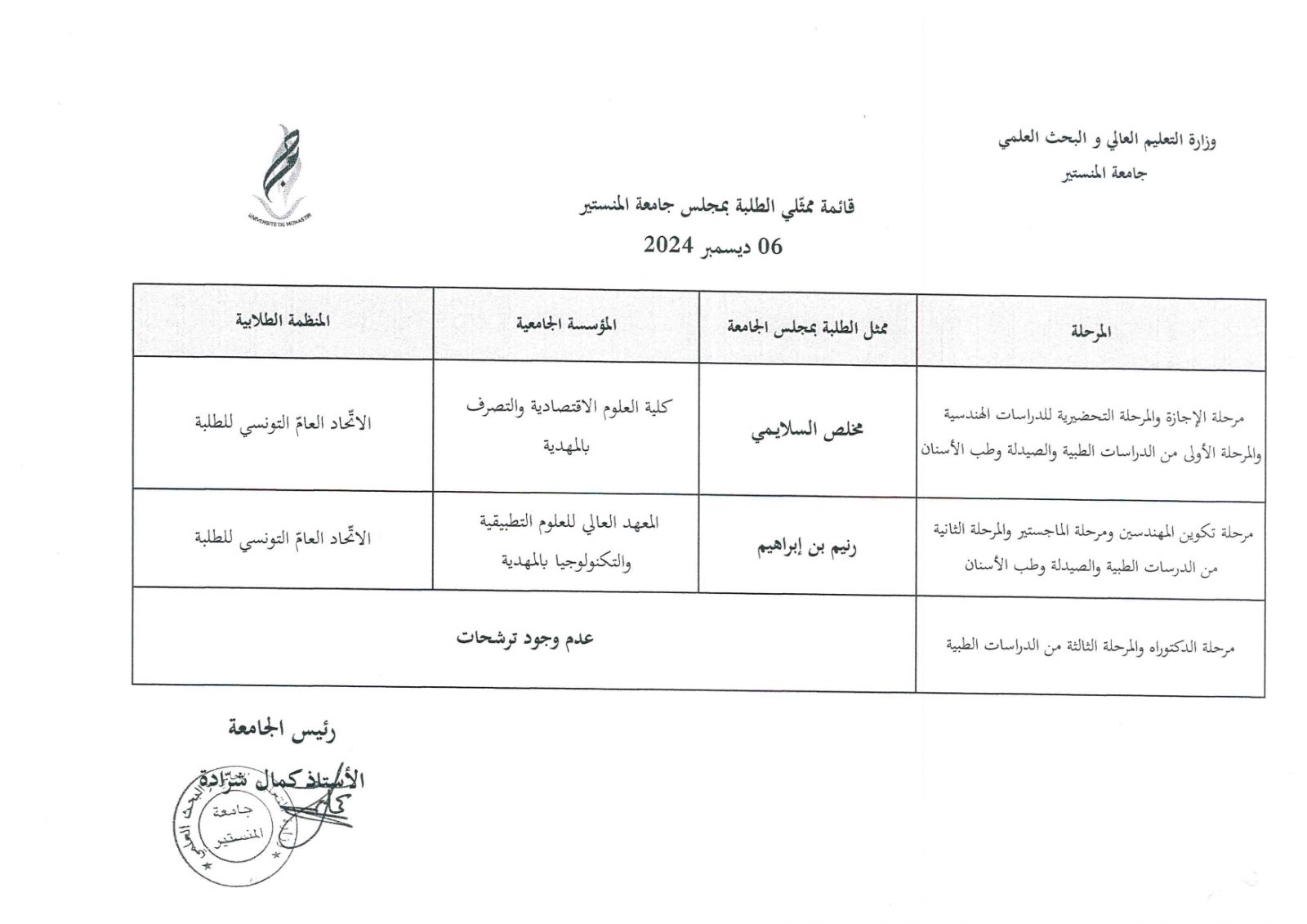 قائمة ممثلي الطلبة بمجلس جامعة المنستير