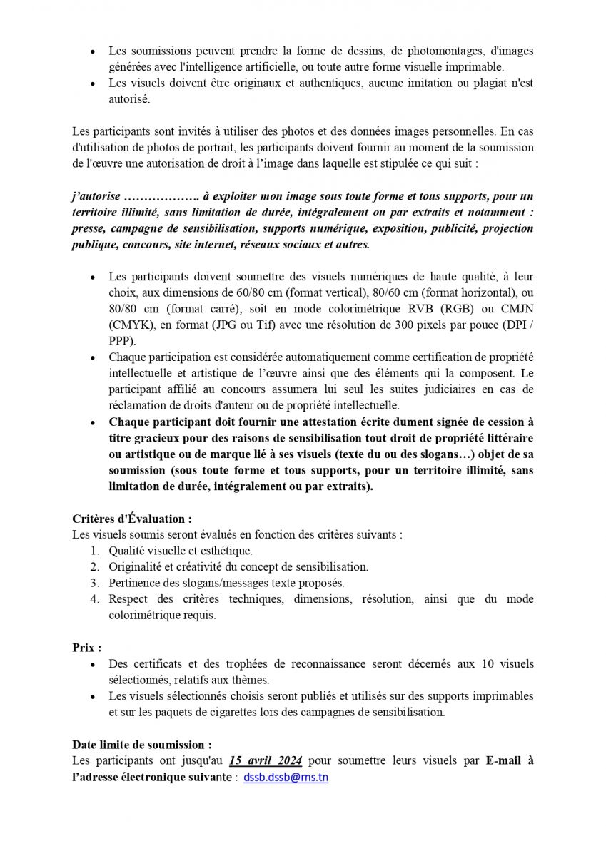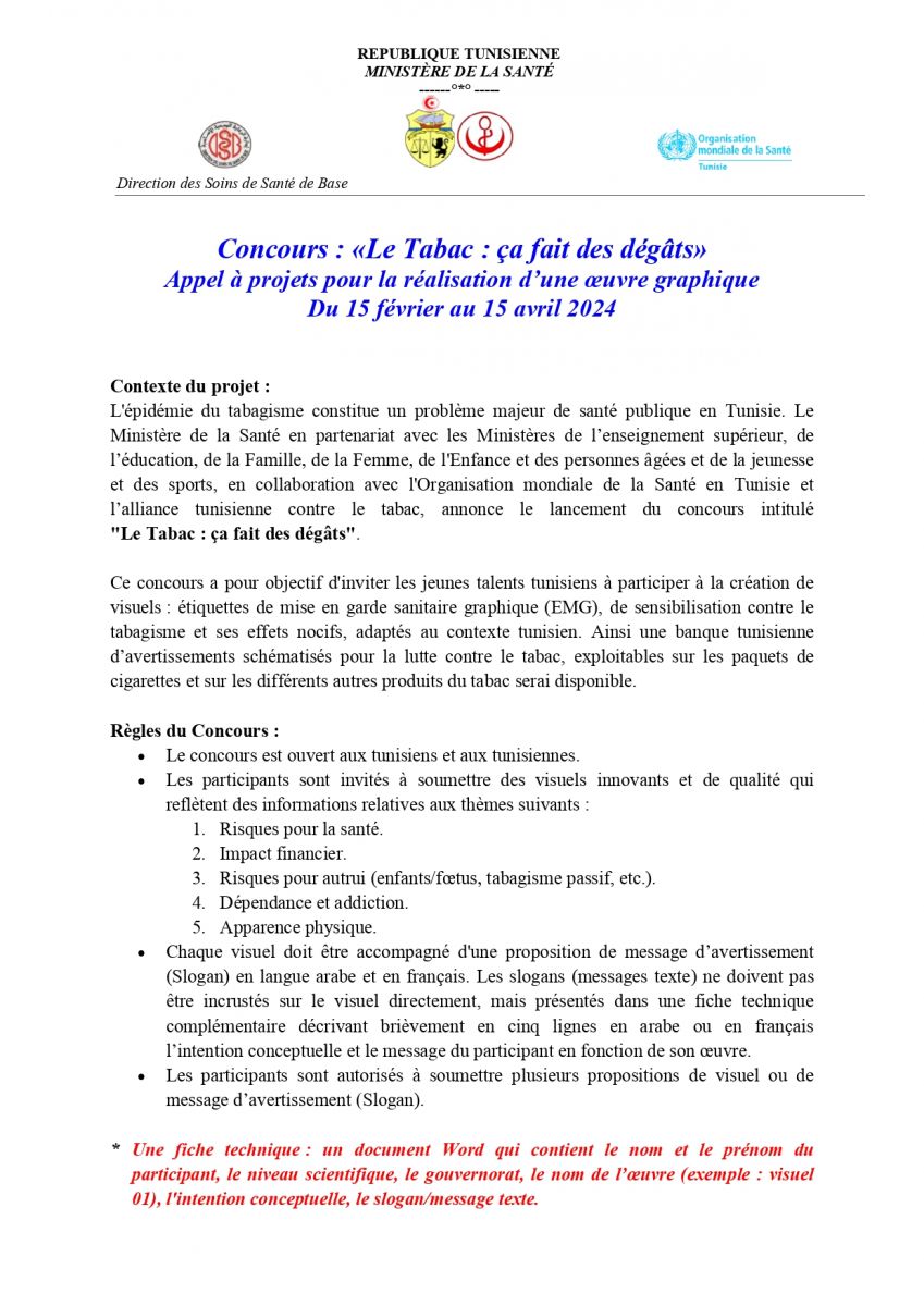في إطار البرنامج الوطني لمكافحة التدخين وتعزيز جهود الدولة التونسية في مكافحة مضاره وما يخلّفه من أضرار بشرية ومادية على المجموعة الوطنية، تعتزم وزارة الصحة بالشراكة مع مكتب تونس لمنظمة الصحة العالمية فتح مسابقة وطنية لإنشاء قاعدة بيانات تونسية (صور وأفكار إبداعية..) لاستغلالها على علب السجائر والتي تنطلق يوم 15 فيفري إلى غاية يوم 15 أفريل 2024.