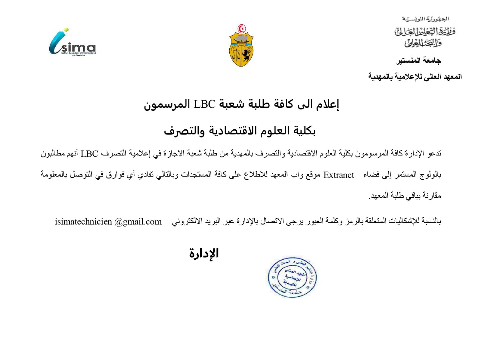 اعلام الى كافة الطلبة المرسمون بكلية العلوم الاقتصادية والتصرف (LBC )