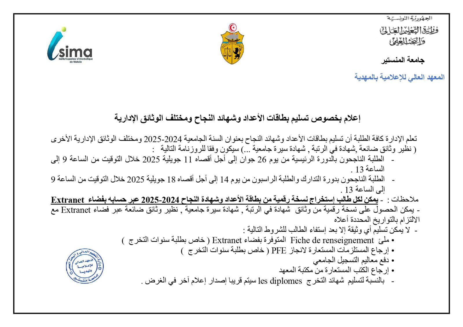 إعلام بخصوص تسليم بطاقات الأعداد وشهائد النجاح ومختلف الوثائق الإدارية