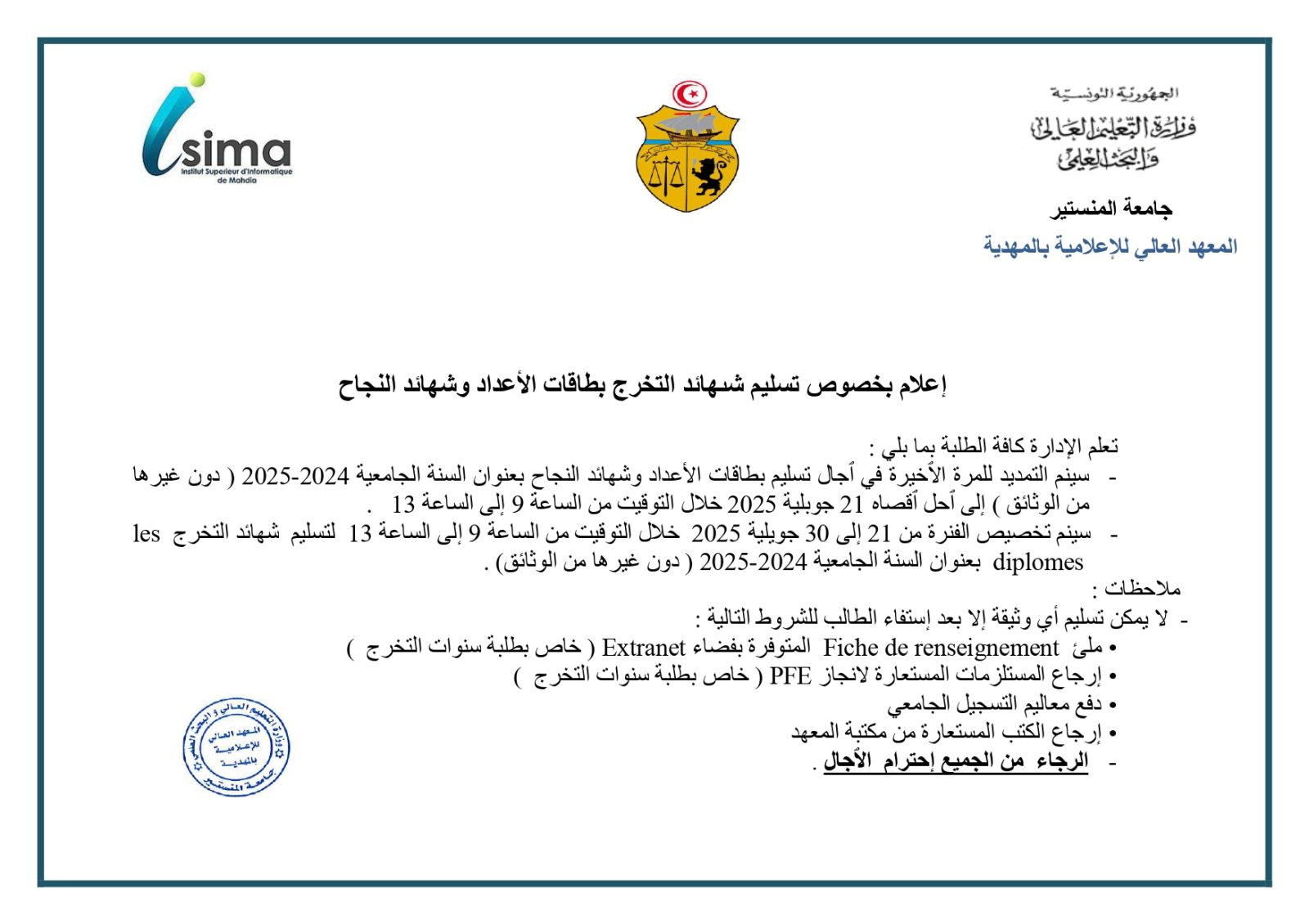 إعلام بخصوص تسليم شىهائد التخرج بطاقات الأعداد وشهائد النجاح
